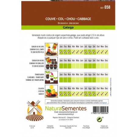 Variedade muito rústica de origem espanhola-galega, que pode atingir 2-3 m de altura. Adapta-se a qualquer tipo de solo e clima. Pode ser cultivada todo o ano. Semear ao ar livre no mês de janeiro a dezembro. Colheita no mês de janeiro a dezembro. Sementes tratadas. Impróprias para consumo humano e animal, destinadas apenas para sementeira.