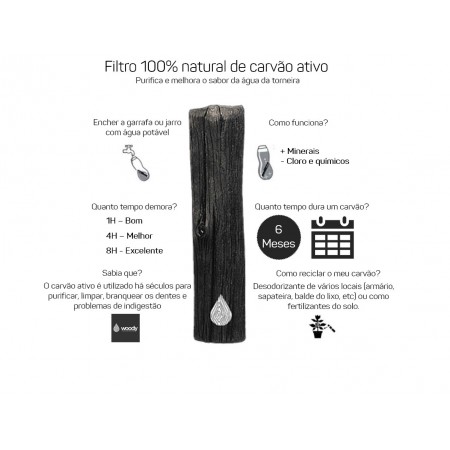 Além da filtração e mineralização da água, o carvão também pode contribuir para a absorção de odores e humidade, como regulador hidrostático em casa, absorção de ondas eletromagnéticas, liberação de íões negativos, como fertilizante natural.