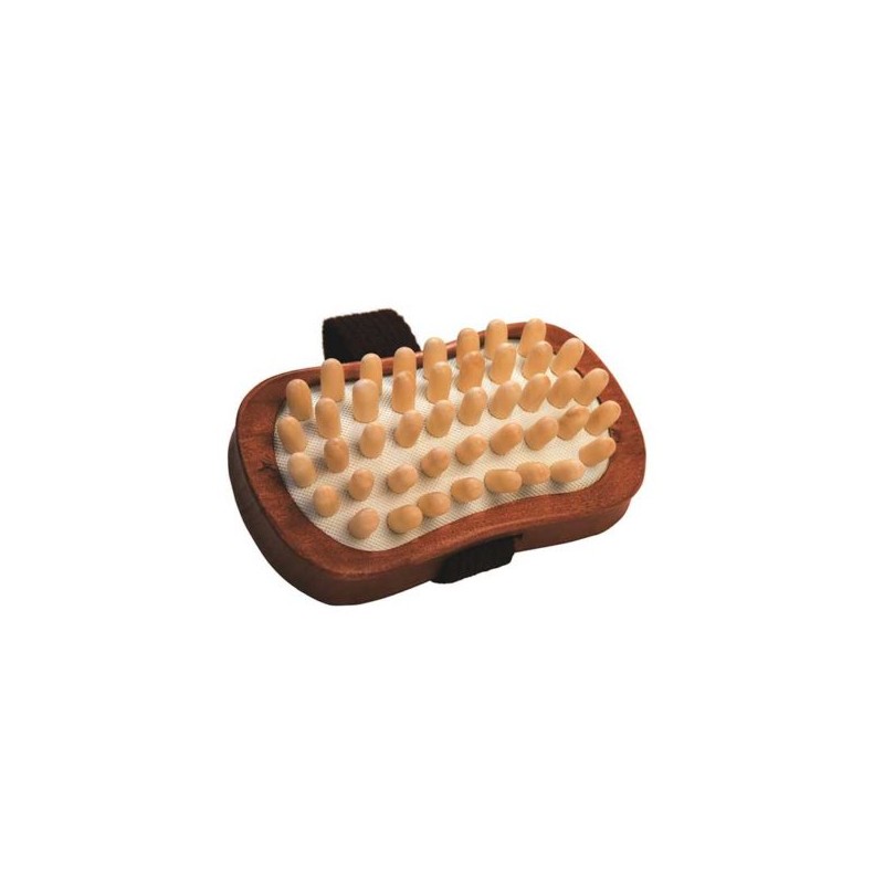 Escova de massagem anti-celulite com pinos de madeira, desenhados para ajudar a ativar a circulação sanguínea e linfática, estimular a drenagem de tecidos e diminuir a celulite, melhorando sua aparência.